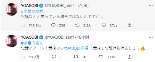 值得注意的是,《机动战士高达:水星的魔女》片尾曲《祝福》的主唱YOASOBI,在结局开播前引用了《祝福》的歌词,希望大家一起来看。又在震撼的结局之后发推称:“现在可能不是说祝福的时候…… ”
