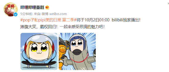 哔哩哔哩番剧官方微博宣布,《Pop子和Pipi美的日常》第二季将于10月2日 01:00在Bilibili独家播出。